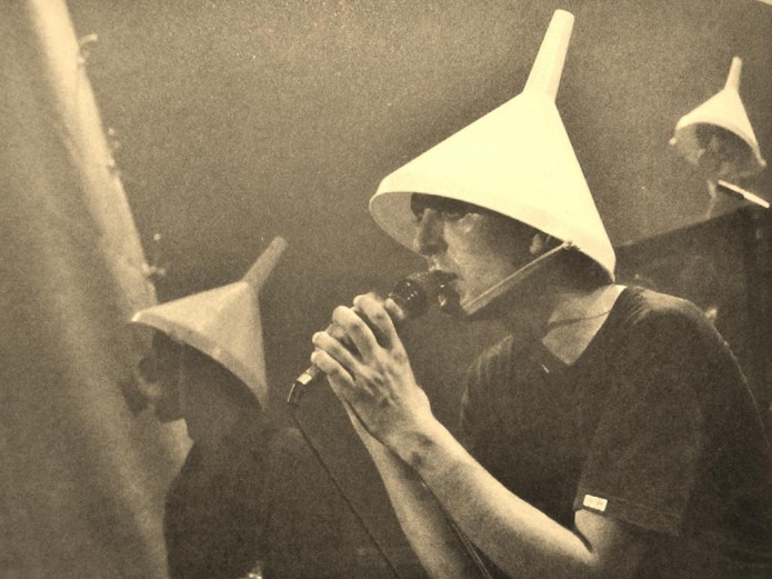 M- Hoy vamos a volar el monumento este… Lo vamos a volar con dinamita. Vais a salir todos volando. Nosotros no, porque tenemos unas campanas anti-reflectantes y separantes del público. Vosotros vais a salir volando todos. Ja! Con la entrada regalamos unas alas estupendas, con unos tirantes de cuero y un precioso motor… No. Yo qué sé. Eso que tú llamas puesta en escena es una pequeña improvisación que sale cada día. Ponemos plásticos, ponemos periódicos, ponemos embudos… bidones… Es simplemente un cruce de casualidades en el momento oportuno.