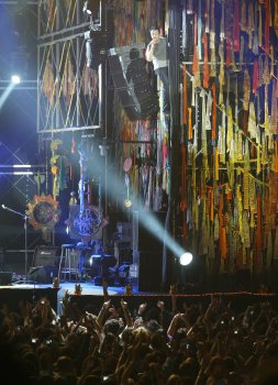 Saltó guitarra en ristre, con Provincia de río Negro y Malva, tras una frase larga en euskera y tocado con una txapela estepariamente encajada hasta las cejas, que reivindicó como símbolo de diferencia. En Bailarás como un indio entró ya en acción la acrobática bailarina Marta Fernández, que acompañaría con sus espectaculares gimnasias muchas de las canciones para un esquema que parece abusivo cuando la redonda descarga rockera, recargada ya con el colorido de la gran pantalla, no parece precisar más sobrecarga escénica. Porque, como ya explicó el jueves en rueda de prensa, el nexo del amigo García con la farándula y su público es «el amor al Rock&Roll». Y macizamente rockeras fueron mayormente sus casi dos horas y media de descarga con un grupo de lujo que trabajó a ratos a tres guitarras y dos baterías.