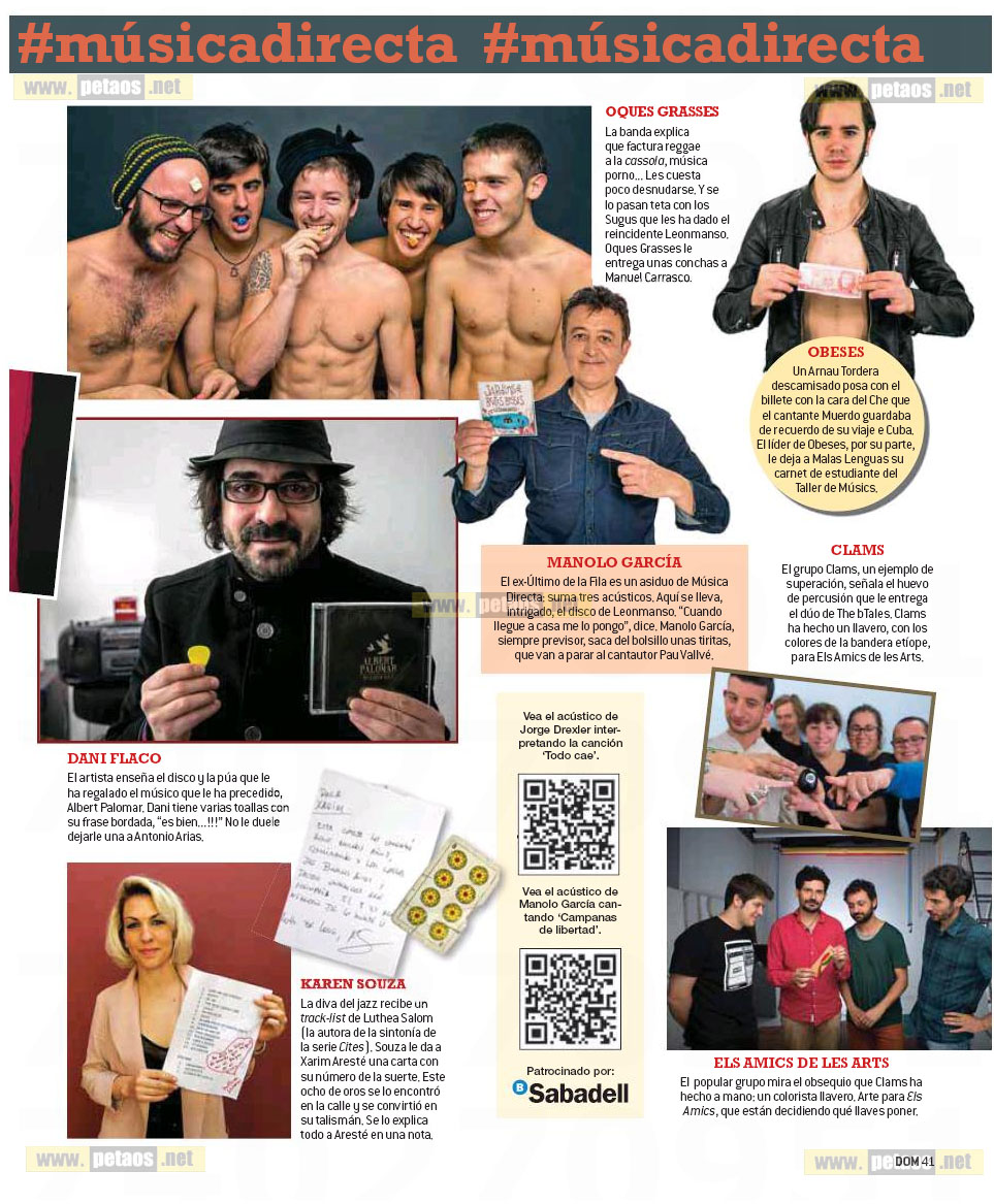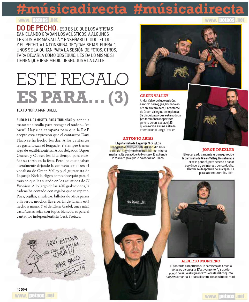Sudar la camiseta para triunfar y tener a mano una toalla para recoger el sudor… «es bien». Hay una campaña para que la RAE acepte esta expresión ,e el cantautor Dani Flaco se ha hecho bordar. A los cantantes les gusta forzar el lenguaje. Y siempre tienen algo de exhibicionistas. A los delgados Oques Grasses y Obeses les falta tiempo para ense-ñar su torso en la foto. Pero los que acaban literalmente dejando la camiseta son otros: el vocalista de Green Valley y el guitarrista de Lagartija Nick la eligen como obsequio para el músico que les sucede en los acústicos de El Periódico. A lo largo de las 400 grabaciones, la cadena ha contado con regalos que se repiten. Púas, rejillas, amuletos, billetes de otros países y llaveros, muchos llaveros. El de Claros está hecho a mano. Y el de Elena Gadel, unas mini castañuelas rojas con topos blancos, es para el cantautor independentista Cesk Freixas.