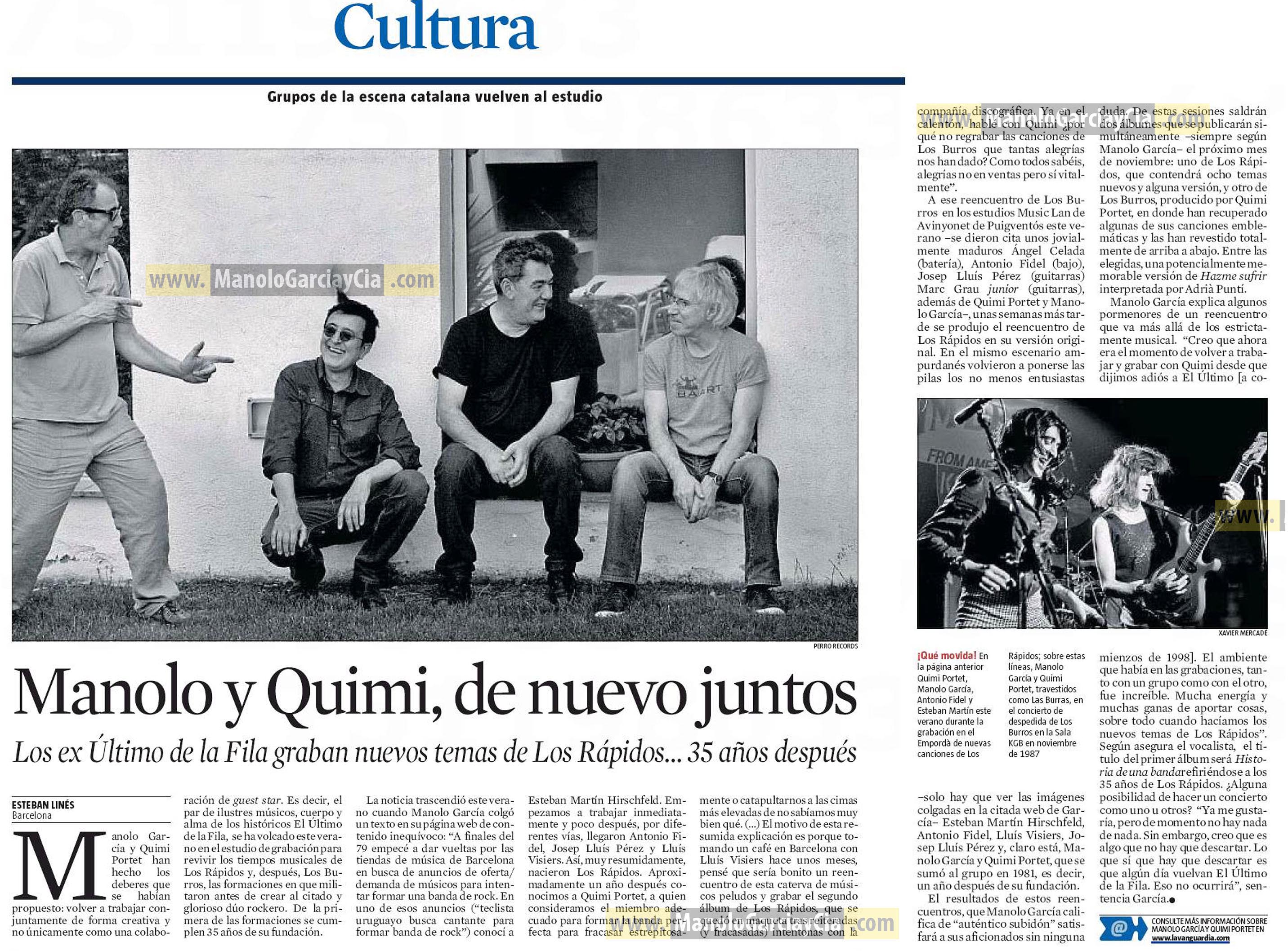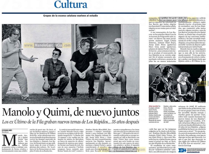 Manolo García explica algunos pormenores de un reencuentro que va más allá de lo estrictamente musical. «Creo que ahora era el momento de volver a trabajar y grabar con Quimi desde que dijimos adiós a El Ultimo [a comienzos de 1998]. El ambiente que había en las grabaciones, tanto con un grupo como con el otro, fue increíble. Mucha energía y muchas ganas de aportar cosas, sobre todo cuando hacíamos los nuevos temas de Los Rápidos». Según asegura el vocalista, el título del primer álbum será “Historia de una banda” refiriéndose a los 35 años de Los Rápidos. ¿Alguna posibilidad de hacer un concierto, con uno u otros? «Ya me gustaría, pero de momento no hay nada de nada. Sin embargo, creo que es algo que no hay que descartar. Lo que sí que hay que descartar es que algún día vuelvan El Último de la Fila. Eso no ocurrirá», sentencia García.