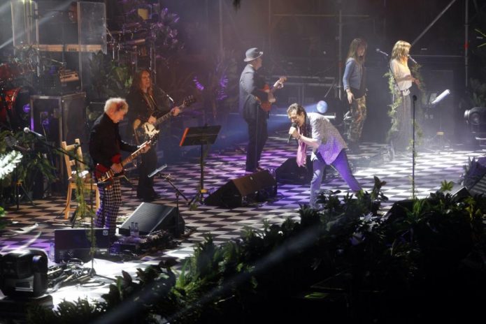 Con un escenario muy poblado, y decorado con motivos vegetales, se arrancó con temas más nuevos. El primero en sonar fue «Canción del Solitario», de su último disco «Todo es ahora», grabado en Nueva York con la colaboración de un grupo de músicos americanos. Los mismos que protagonizaron la primera parte de su recital de ayer en el Palacio de Deportes de La Guía «Adolfo Suárez». Entre ellos, Earl Slick y Gerry Leonard a las guitarras, Zachary Alford a la batería y Jack Daley al bajo; músicos que cuentan en sus prestigiosa trayectoria con actuaciones junto a grandes nombres del panorama internacional de la talla de David Bowie, Lenny Kravitz, Bruce Springsteen o John Lennon.