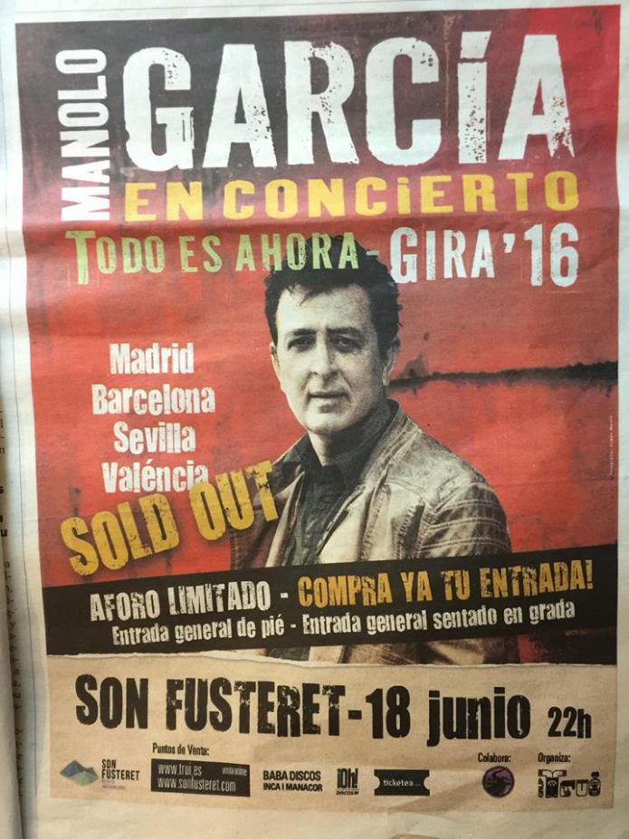 Manolo García de concierto en Mallorca! 2 junio, 2016Manolo GarcíaNo queda nada para que #ManoloGarcía esté de concierto en #Mallorca @SonFusteret #TodoEsAhora #Gira2016 Tweet
