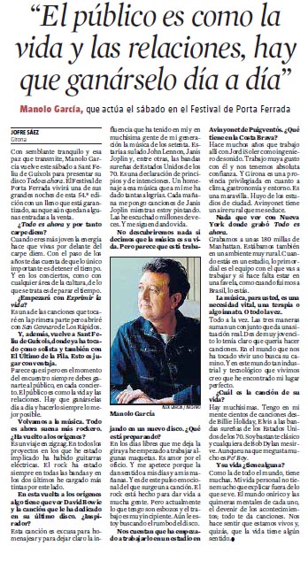 Con semblante tranquilo y esa paz que transmite, Manolo García vuelve este sábado a Sant Feliu de Guíxols para presentar su disco Todo es ahora. El Festival de Porta Ferrada vivirá una de sus grandes noches de esta 54.ª edición con un lleno que está garantizado, aunque aún quedan algunas entradas a la venta.