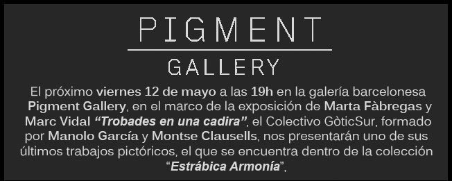 El próximo viernes 12 de Mayo a las 19h en la Galería Barcelonesa Pigment Gallery en el marco de la exposición de Marta Fàbregas y Marc Vidal «Trobades en una cadira» (Encuentros en una silla), el colectivo GòticSur, formado por Manolo García y Montse Clausells, nos presentarán uno de sus últimos trabajos pictóricos, el que se encuentra dentro de la colección «Estrábica Armonía».