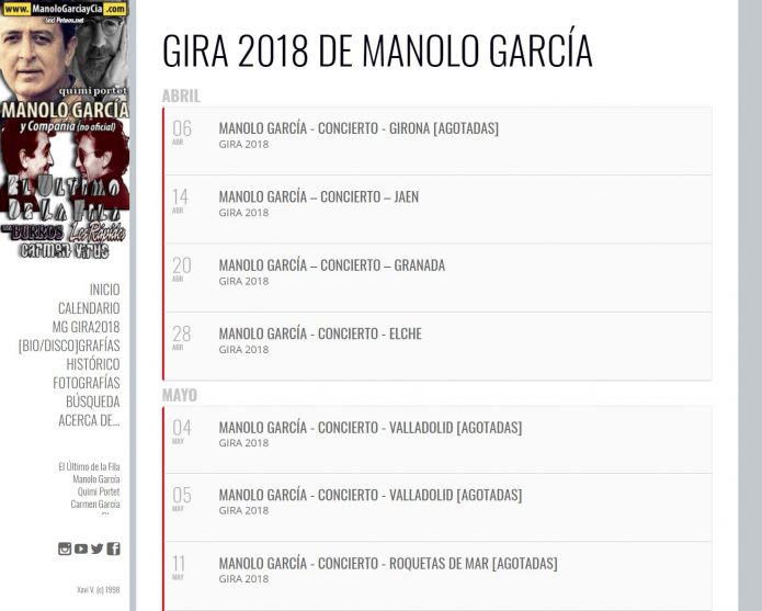 Es posible que veáis aquí información, o un concierto que no esté en otro lado, ni siquiera en la página oficial de Sony de Manolo García; la información que compartimos y publicamos aquí, en nuestro Facebook (https://www.facebook.com/ManoloGarcia.y.companyia/), Twitter (https://twitter.com/manologarcia_c) o Instagram (https://www.instagram.com/manologarciaycia/), ESTÁ COMPROBADA y CONFIRMADA lcon los responsables de la Gira y el mismo artista; salvo error o cambios de última hora.