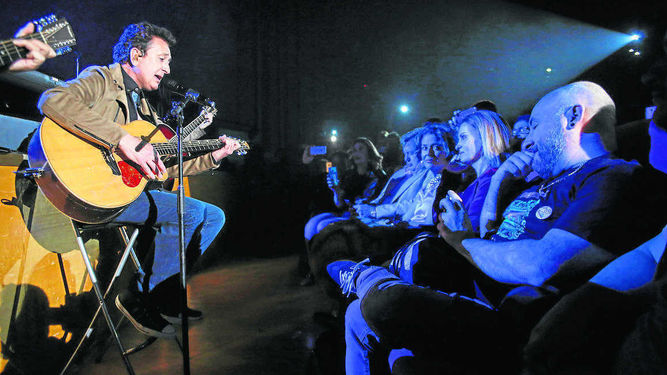 Entró por la puerta como uno más, sorprendiendo a su público fiel y puntual, que entró en calor gracias a El frío de la noche y al ardiente ambiente que se respiraba en el auditorio abarrotado. También sonaron temas como Fragua de los cuatro vientos, un giro teatral o un alma de papel.