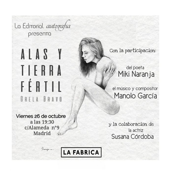 Esta tarde en La Fábrica (Alameda, 9. Madrid) presentación «Alas y tierra fértil» 26 octubre, 2018Manolo GarcíaEsta tarde en La Fábrica, calle Alameda, 9, Madrid, Presentación «Alas y tierra fértil» de ArticulArte – Grela Bravo, arropada por Miki Naranja, Manolo García y Susana Córdoba. A las 19:30. Amanece Metrópolis. Tweet