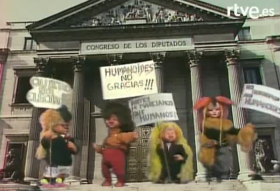 – Aquí, La bola de cristal habla sobre racismo, mostrando, por ejemplo, a Massiel disfrazada de cantante negro. También explican el apartheid en Sudáfrica.