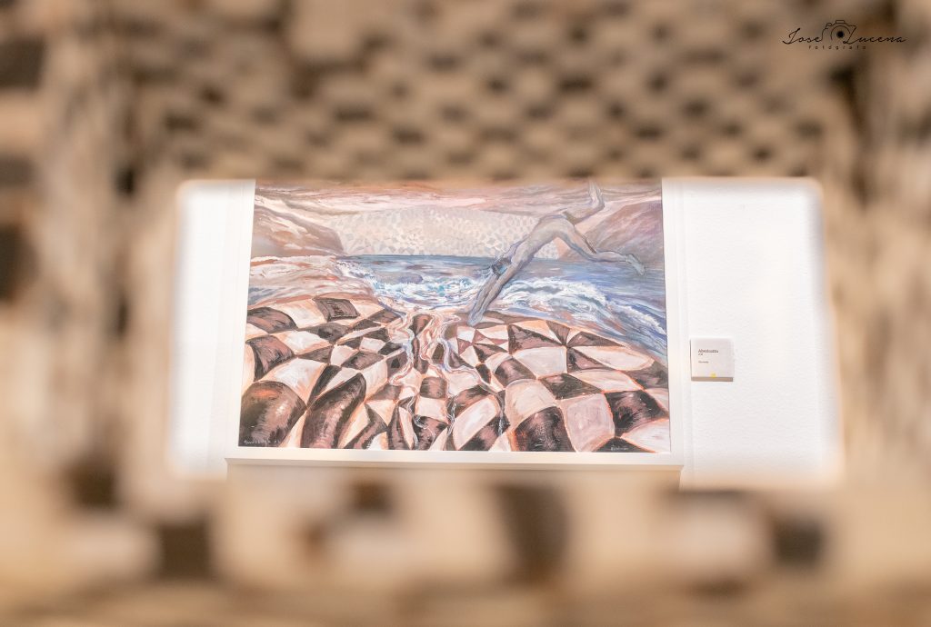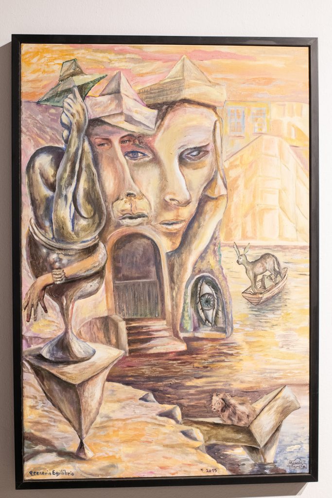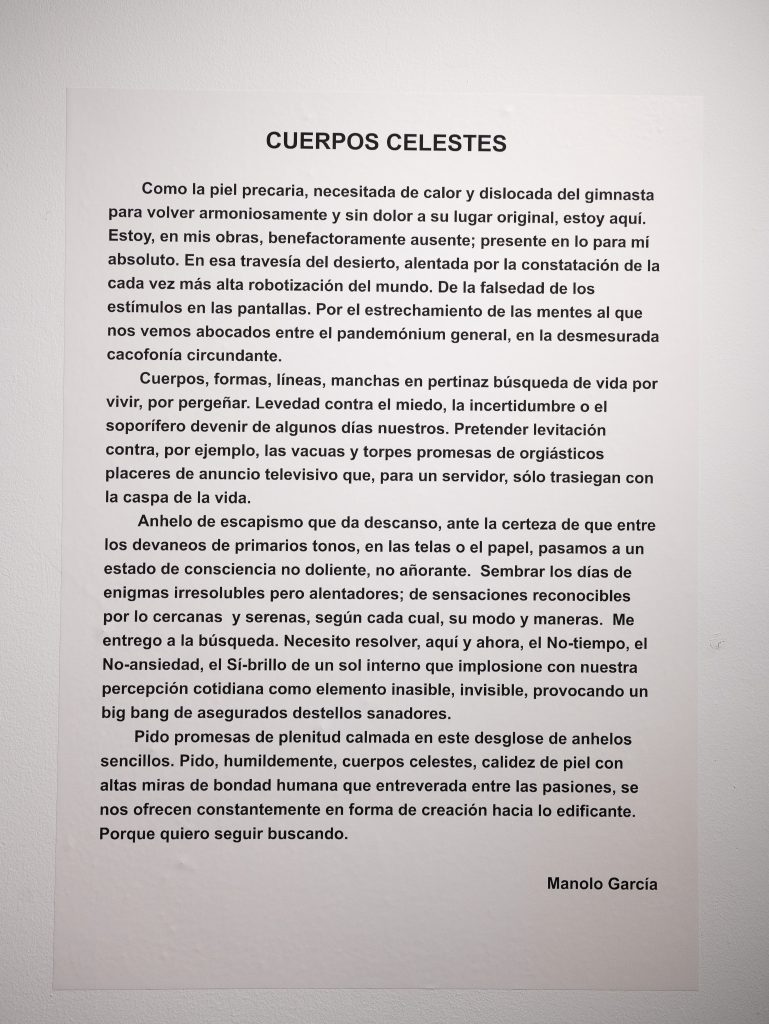 A la derecha del cuadro, un texto del autor nos desgrana la intención de la exposición, la necesidad de la creación frente al mundo actual, vacío y absurdo, poblado de pantallas y falsos brillos de abalorios deslumbrantes. La búsqueda, sempiterna compañera de Manolo, es vela en los días grises, y motor de viento cuando la humanidad se arrodilla en los altares de la sociedad de la competitividad y del vano destello de la tecnología.
