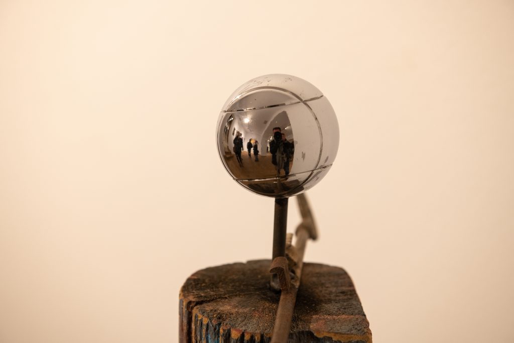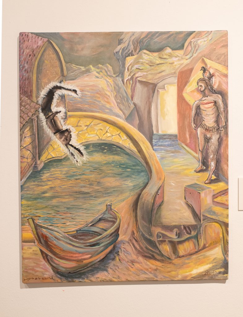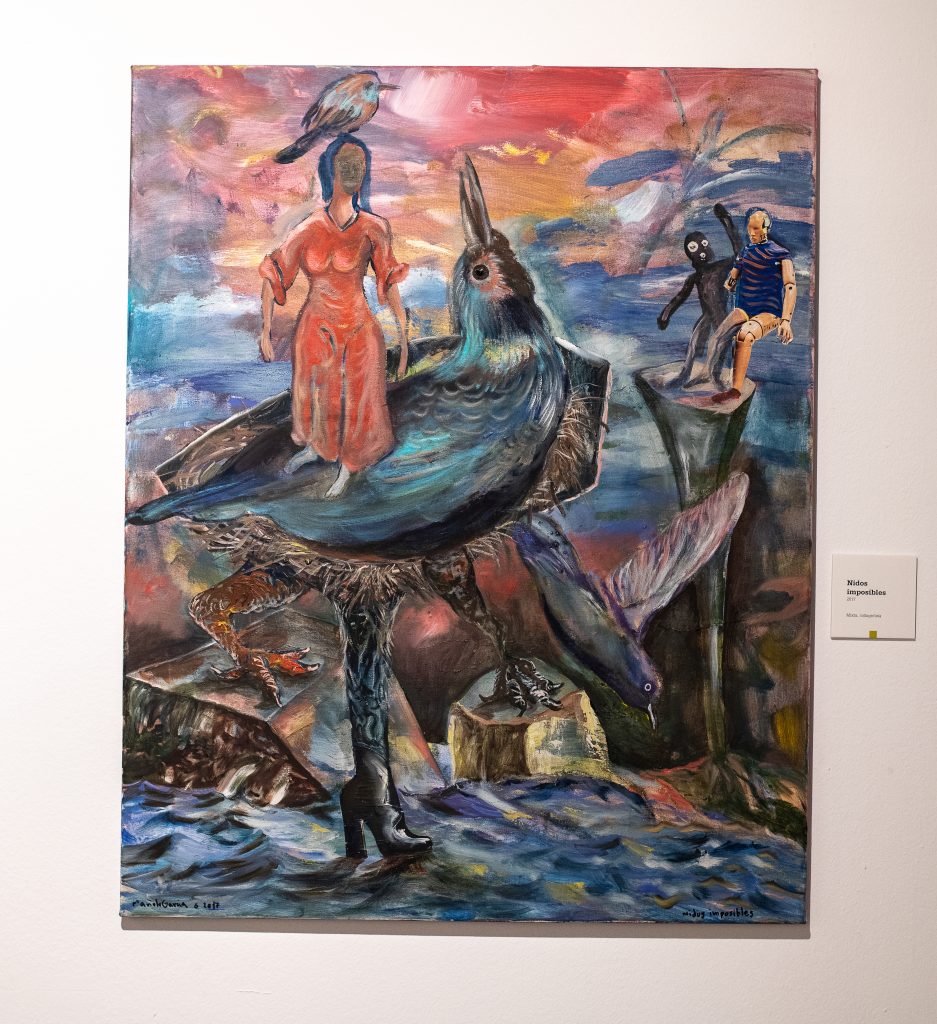 Sugerentes títulos, que nos dan pistas en ese intrincado laberinto de lo personal, van multiplicando el placer de reconocer un mensaje en las imágenes. “Nidos imposibles, Doliente mundo, Precario equilibrio, Infancia feliz” … García se monta en su barca y se adentra en un mundo onírico donde seres extraños conviven y lavan el dolor, donde beben del manantial de otro tiempo, del eco de las risas en las quebradas de la infancia. La interpretación de cada obra es un labor compleja e individual que a unos sugieren luz y a otros grito de oleo. El silencio y emoción se alían por un instante. Un corredor nos conecta con otra estancia de la casa donde conviven unos 30 dibujos a carboncillo, aquellos que fueron compañía y solaz en los hoteles por los que fue pasando la gira del Geometría del rayo. Y junto a ellos, completando la exposición, una serie de esculturas, al modo daliniano de aparells, donde García demuestra que el arte nos reclama desde los objetos más insospechados, y que cualquier elemento es un medio de expresión válido.