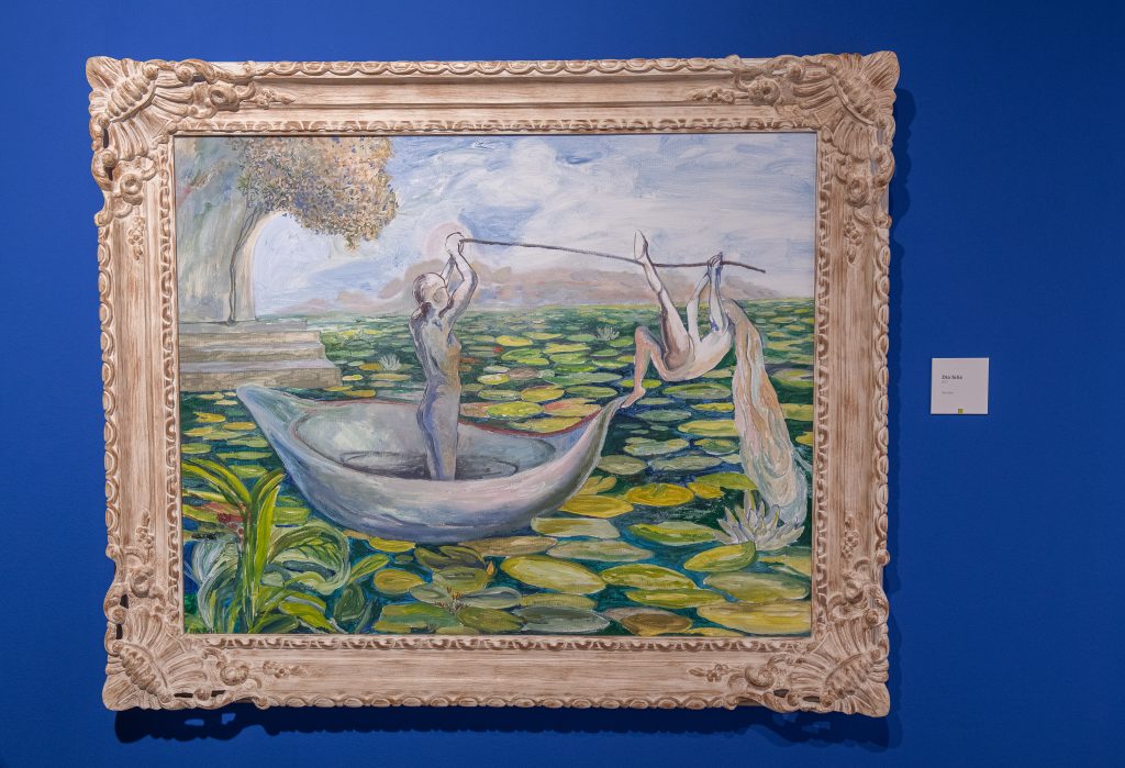 La sala donde se ha montado la exposición, es un rectángulo diáfano de 300 metros cuadrados con techos altos donde el sonido de la reflexión rebota entre pasos y miradas de sorpresa. En una pared azul cobalto se puede leer en grandes letras “Manolo García. Cuerpos celestes”, junto a las letras, su conocido cuadro, “Día feliz”, enmarcado en un tono nacarado, con motivos vegetales y conchas en las esquinas. En el lienzo un barquero en pie, juega con una pértiga en la que una mujer de pelo largo hace equilibrios en el extremo de la barca, a su izquierda un árbol, al fondo las montañas y bajo la embarcación una multitud de nenúfares.
