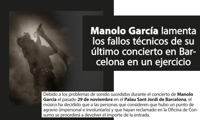 Debido a los problemas de sonido sucedidos durante el concierto de Manolo García el pasado 30 de noviembre en el Palau Sant Jordi de Barcelona, el músico ha decidido que a las personas que consideren que hubo un punto de agravio (impersonal e involuntario) y que hayan reclamado en la Oficina de Consumo se procederá a devolver el importe de la entrada.