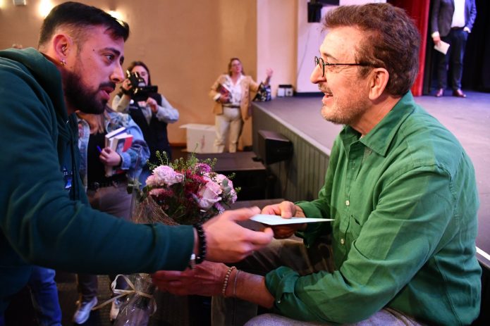 Presentó su primer libro de relatos “Títere con cabeza” con el que se evade del mundo caótico y el alcalde de San Roque, Juan Carlos Ruiz Boix, la teniente de alcalde de Cultura, Ana Ruiz, y otros ediles saludaron al artista antes de salir al escenario.