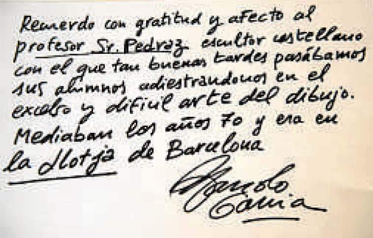 “El primer golpe es instintivo; luego mi paso por el colegio, pero el importante llega cuando leo un anuncio de Demandas en La Vanguardia donde un señor de La Verneda busca a un aprendiz de pintor. Tenía que pintar trozos de cuadros que se regalaban en unas promociones que hacía Muebles La Fábrica. Éramos cinco chavales que pintábamos en cadena y yo me encargaba de hacer cielos y lagos. Al final, el cuadro volvía al maestro y le daba algún retoque. Estuve un año, aprendí muchas cosas, y él sin saberlo me enseñó que podía dedicarme a la pintura”. Por http://www.manologarciaycia.com