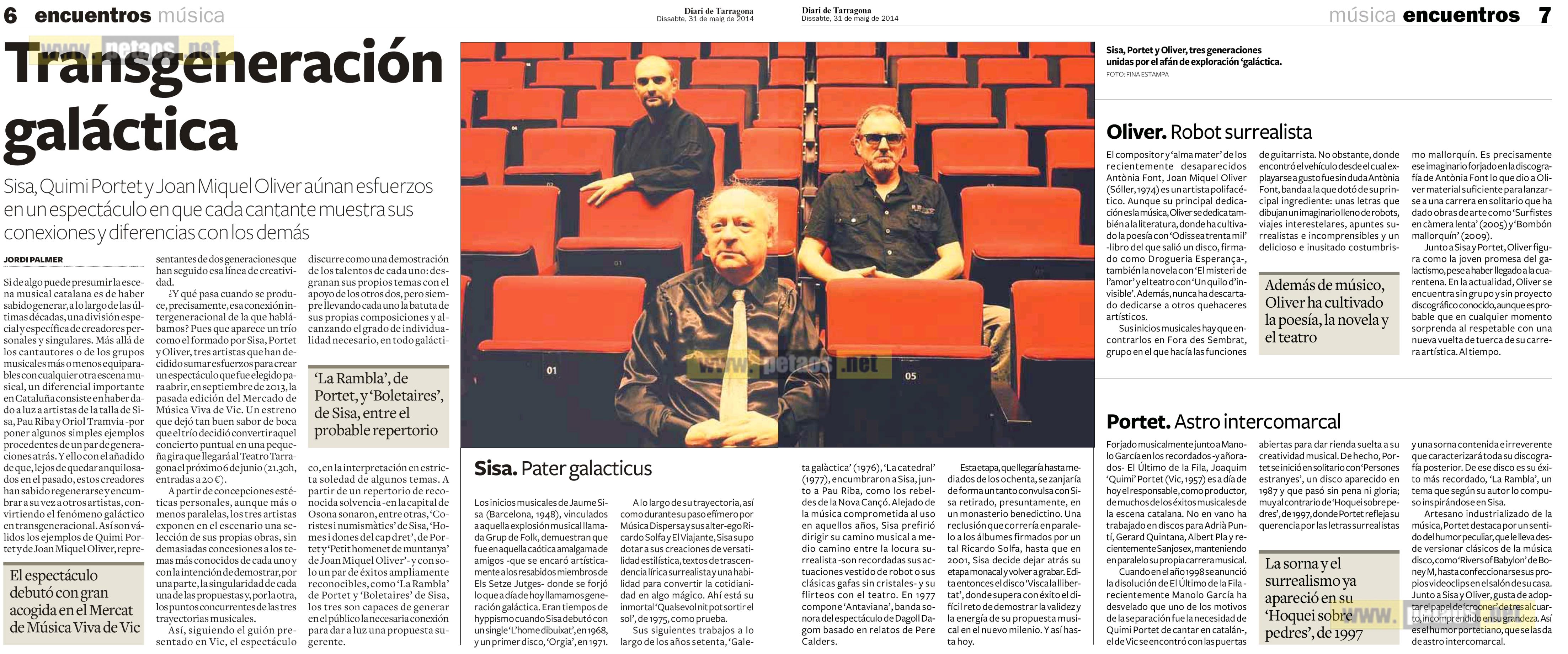 ¿Y qué pasa cuando se produce, precisamente, esa conexión intergeneracional de la que hablábamos? Pues que aparece un trío como el formado por Sisa, Portet y Oliver, tres artistas que han decidido sumar esfuerzos para crear un espectáculo que fue elegido para abrir, en septiembre de 2013, la pasada edición del Mercado de Música Viva de Vic. Un estreno que dejó tan buen sabor de boca que el trío decidió convertir aquel concierto puntual en una pequeria gira que llegará al Teatro Tarragona el próximo 6 de junio (2a.3oh, entradas a 20€).